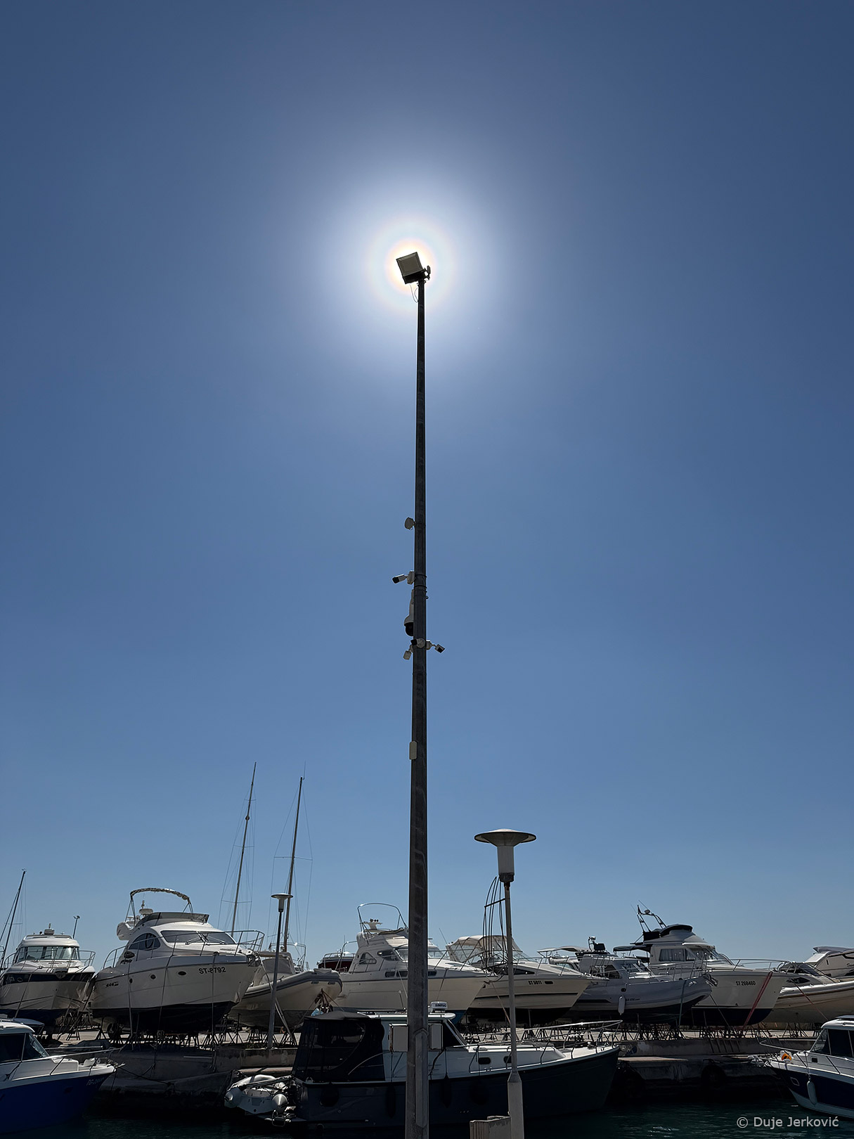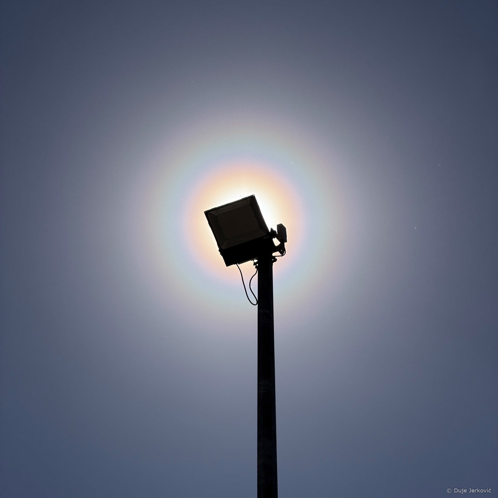 Drugi zanimljiv vijenac dolazi nam iz južnih krajeva. Prije par dana javio mi se Duje Jerković, onaj koji je s Mosora u veljači fantastično snimio Merkur, Veneru i Mjesec, da oko Sunca vidi šarene krugove. Bio je to peludni vijenac – vijenac koji ne nastaje na kapljicama vode u oblacima nego na zrncima peludi u zraku. Za ogib svjetlosti, naime, uglavnom nije važno od čega se sastoje čestice jer se najbitnije događa na njihovim rubovima.
