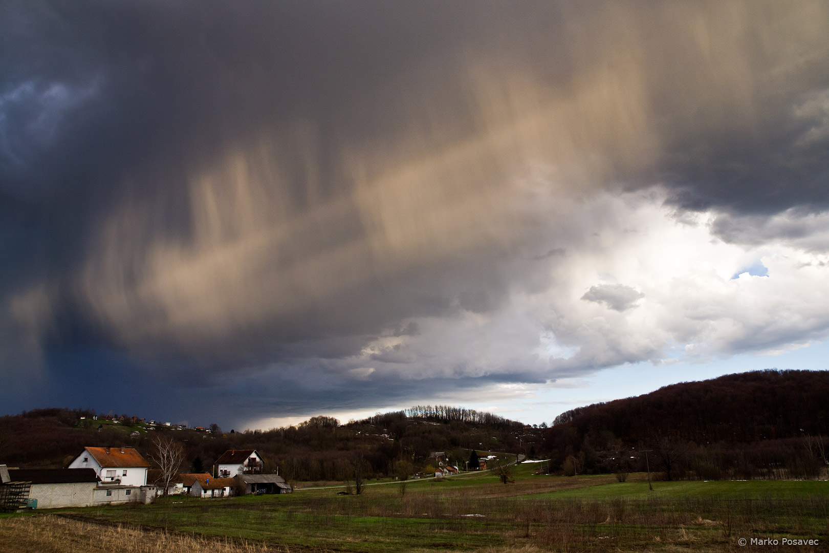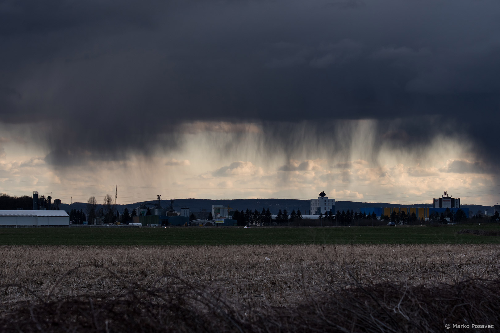 Ovo je granični slučaj jer su oborinske zavjese jako nisko, nešto njihovih kapljica možda i dolazi do tla. Izgledaju prilično dramatično. Matični oblak je kumulonimbus. Snimio Marko Posavec, Koprivnica, 10. 3. 2017.